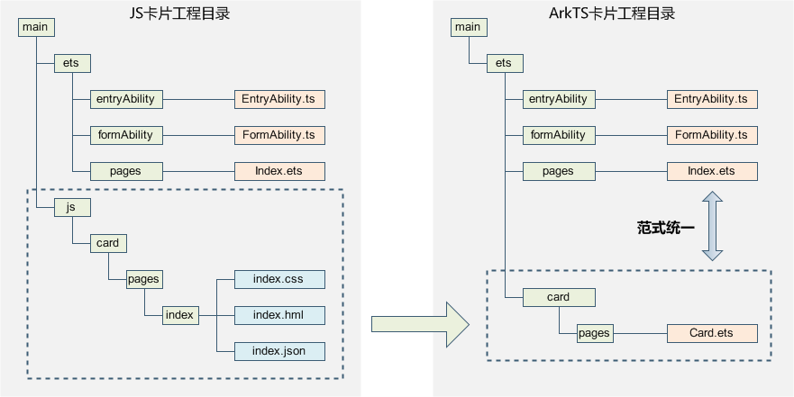 - Stage模型支持两种卡片开发方式,可以基于声明式范式ArkTS语言开发ArkTS卡片、也可以基于类Web范式JS语言开发JS卡片。