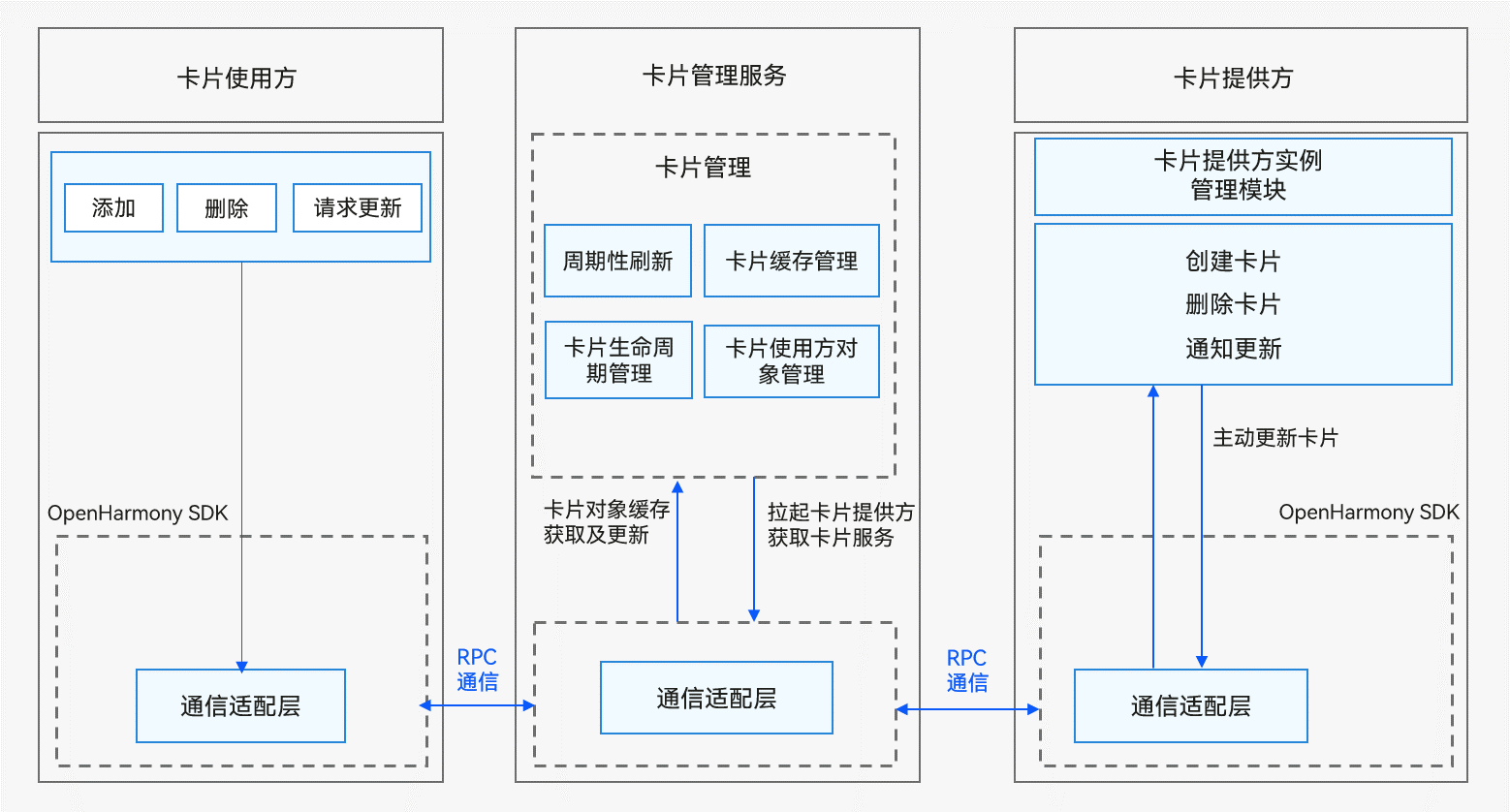 卡片管理服务:用于管理系统中所添加卡片的常驻代理服务,包括卡片对象的管理与使用,以及卡片周期性刷新等。