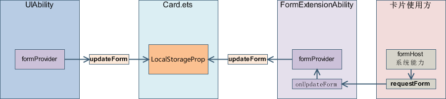 - FormExtensionAbility:卡片业务逻辑模块,提供卡片创建、销毁、刷新等生命周期回调。
