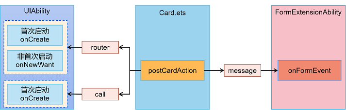 - ArkTS卡片特有能力:postCardAction用于卡片内部和提供方应用间的交互,仅在卡片中可以调用。