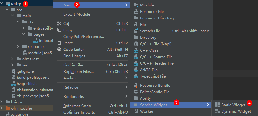 在已有的应用工程中,可以通过右键新建ArkTS卡片,具体的操作方式如下。