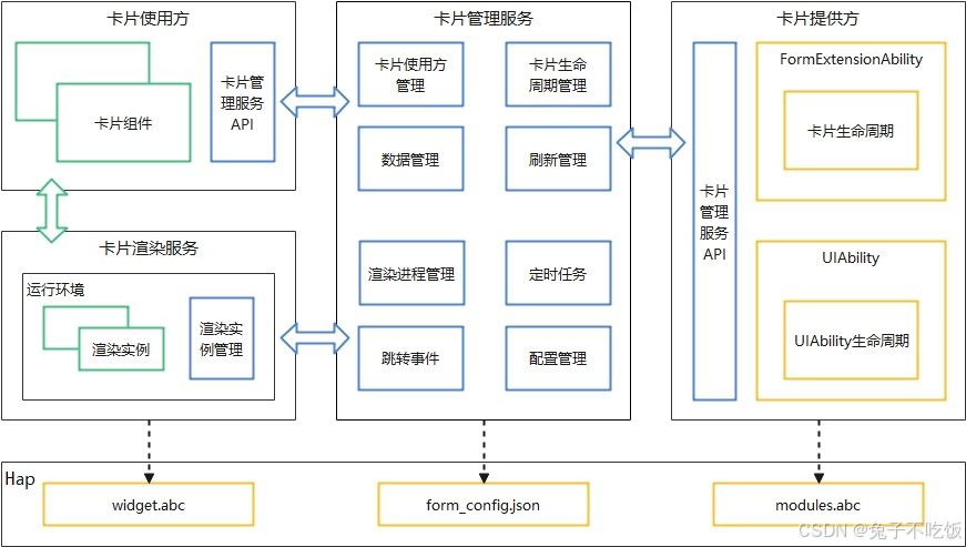 FormExtensionAbility:卡片扩展模块,提供卡片创建、销毁、刷新等生命周期回调。