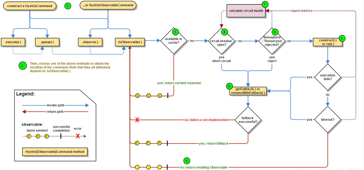 - 8:计算熔断器状态,所有的运行状态(成功, 失败, 拒绝,超时)上报给熔断器,用于统计从而判断熔断器状态.