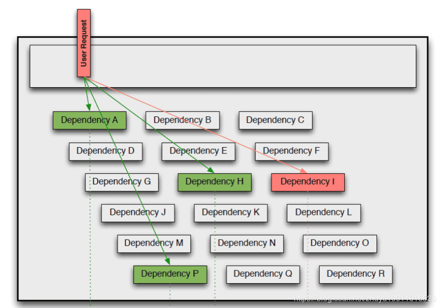 住压力导致内部错误或资源耗尽,一直不响应,此时更糟糕的是其他服务对 I 有依赖,那么这些依赖 I 的服务一直