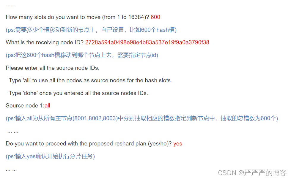 执行流程:提示要分配多少槽-》接收节点ID-》all/done;