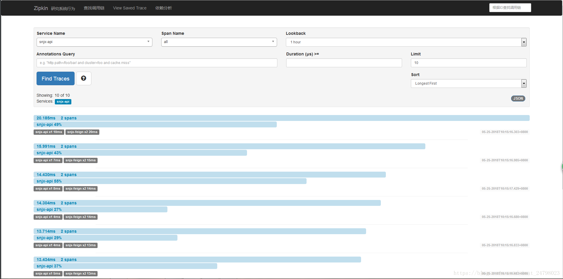 应用程序用于向Zipkin报告时间数据。Zipkin用户界面还提供了一个依赖关系图,显示每个应用程序有多少跟踪请求。如果您正在解决延迟问题或错误问题,则可以根据应用程序,跟踪长度,注释或时间戳过滤或排序所有跟踪。一旦选择了一个跟踪,您可以看到每个跨度所花费的总跟踪时间的百分比,从而可以确定问题应用程序。