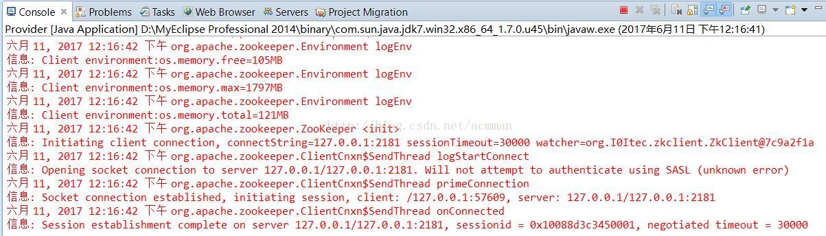 首先运行服务提供者的启动类Provider,此时服务提供者已经将服务注册到注册中心Zookeeper中了: