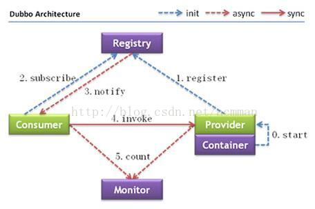 一个使用Dubbo的系统架构图如下:可分为以下几个角色:(1)Provider:暴露服务的服务提供方。(2)Consumer:调用远程服务的服务消费方。(3)Registry:服务注册与发现的注册中心。(4)Monitor:统计服务的调用次调和调用时间的监控中心。(5)Container:服务运行容器。其中上面的调用关系为:0.服务容器负责启动,加载,运行服