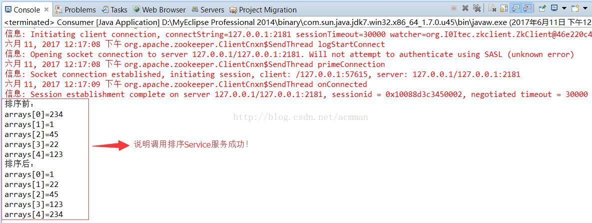 然后启动服务的消费者,此时消费者会在注册中心寻找需要的名为“sortService”服务实现,然后引入,执行相关的服务逻辑,最终的执行结果为: