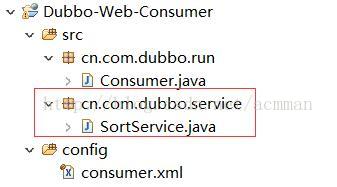 注意:这里为了简化工程,我们没有使用Maven去关联服务提供方和消费者,所以我们在消费者的src中创建了sortService的接口: