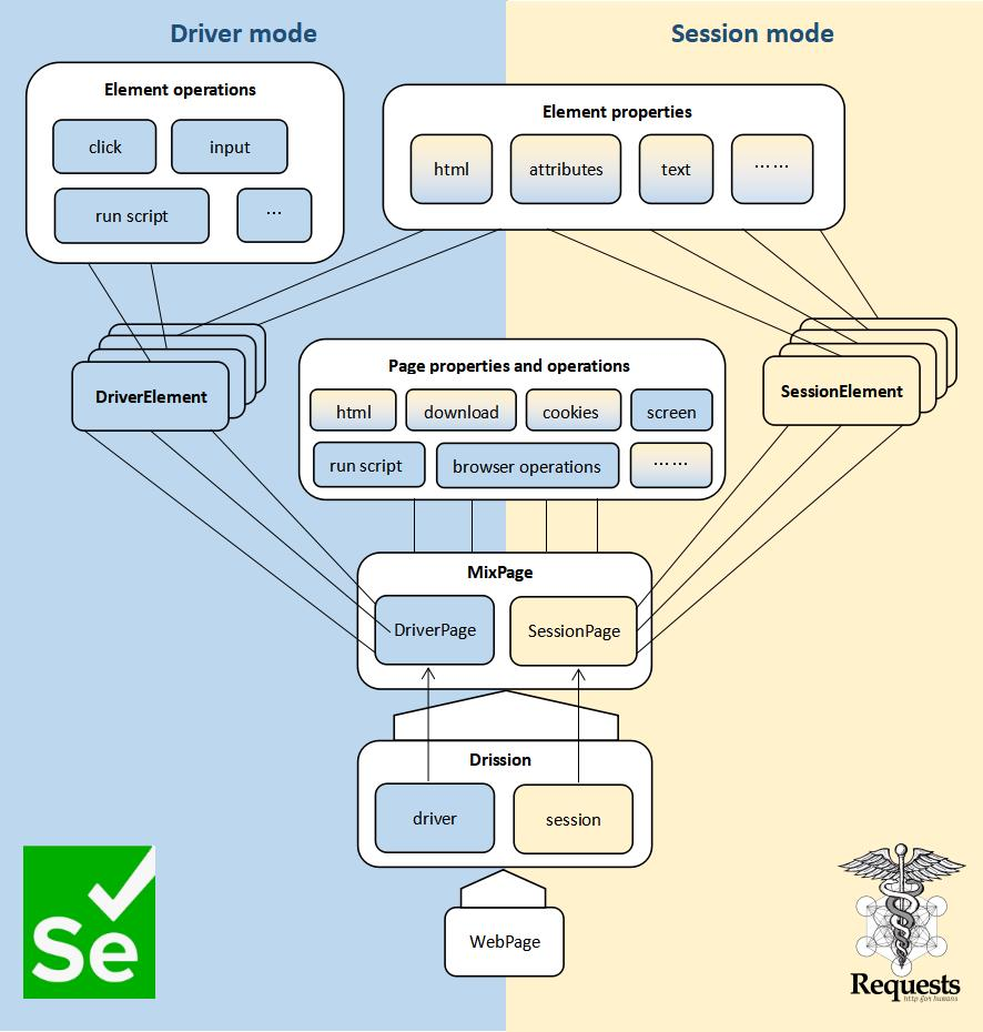 因此,这个库将 selenium 和 requests 合二为一,不同需要时切换相应模式,并提供一种人性化的使用方法,提高开发和运行效率。除了合并两者,本库还以网页为单位封装了常用功能,简化了 selenium 的操作和语句,在用于网页自动化操作时,减少考虑细节,专注功能实现,使用更方便。