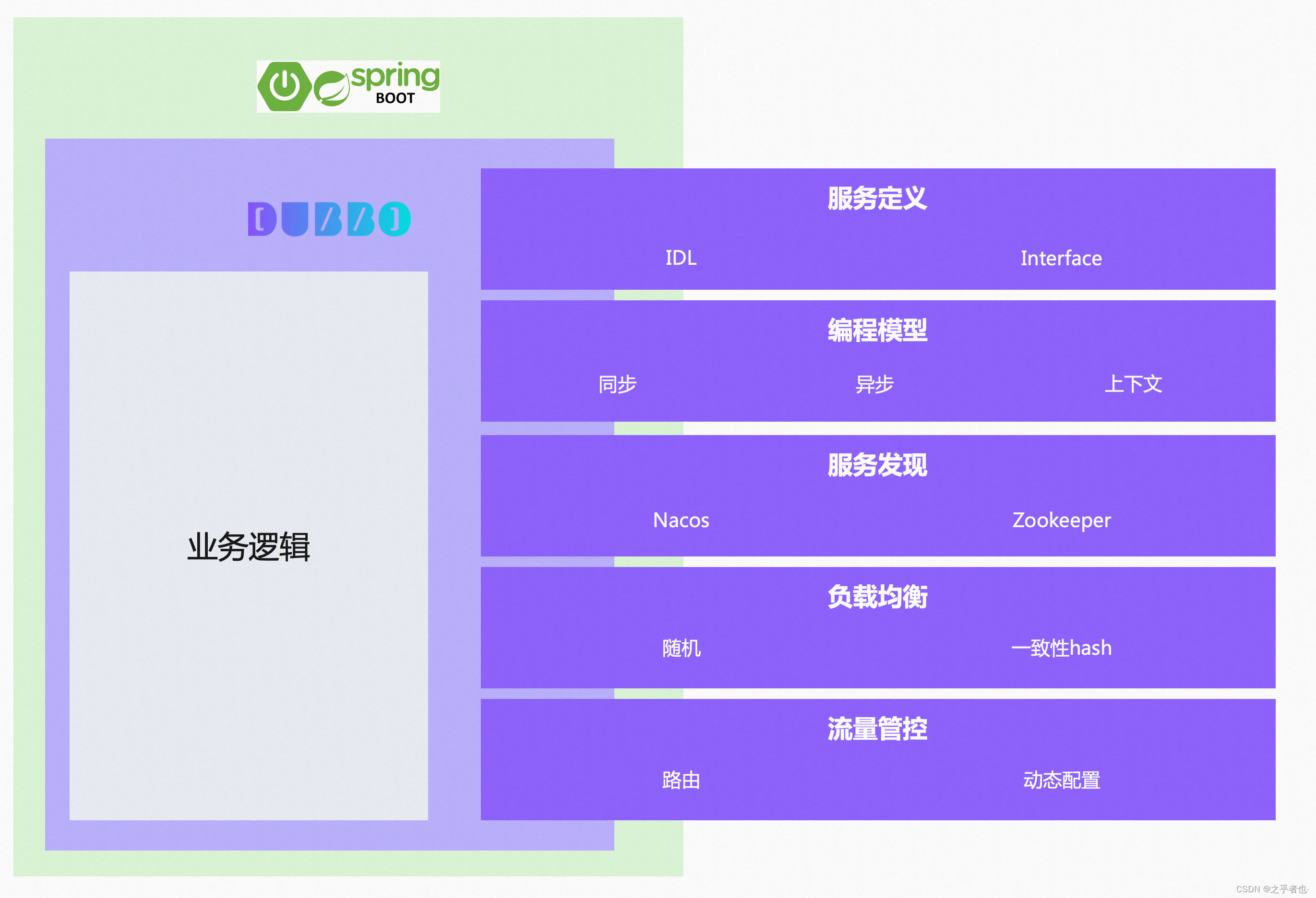 Dubbo 不是应用框架的替代者,它可以很好的工作在每种语言的主流编程框架之上,以 Java 为例,Dubbo 可以很好的与 Spring 协作,并在此基础上提供服务定义、微服务编程、服务发现、负载均衡、流量管控等能力。