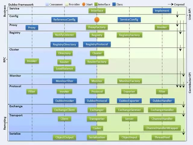封装RPC调用,以Invocation和Result为中心,扩展接口为Protocol、Invoker和Exporter。Protocol是服务域,它是Invoker暴露和引用的主功能入口,它负责Invoker的生命周期管理。Invoker是实体域,它是Dubbo的核心模型,其它模型都向它靠拢,或转换成它,它代表一个可执行体,可向它发起invoke调用,它有可能是一个本地的实现,也可能是一个远程的实现,也可能一个集群实现。