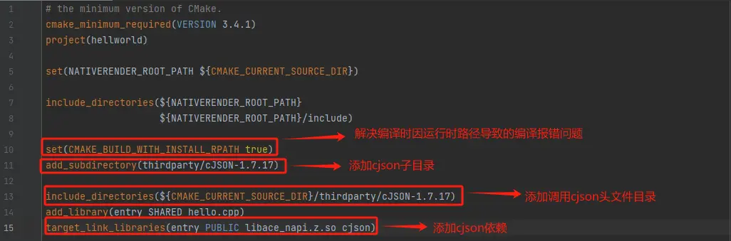 原生库源码准备完后,我们需要将库加入到工程的编译构建中。在工程目录CPP下的CMakeLists.txt文件中,通过add_subdirectory将cJSON加入到编译中,并通过target_link_libraries添加对cjson的链接,如下图: