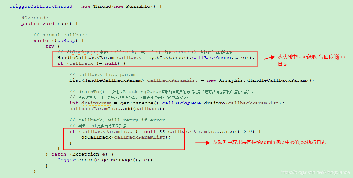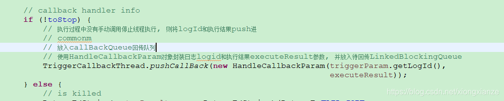 当executor执行器执行完成调度任务时, 就将本次调度的执行结果和logId封装成HandlerCallbackParam参数, 再入队列.执行调度任务是在JobThread线程完成的, 下一篇将着重分析jobThread是如何执行本次任务的.