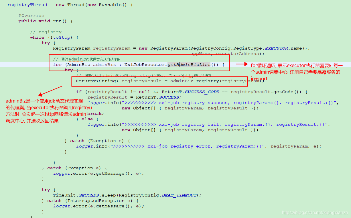 该线程有两个作用, 一是, 作为executor执行器和admin调度中心的心跳, 二是, 作为executor执行器向admin调度中心的注册ip+port的线程.