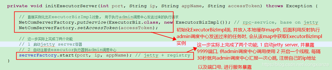 ④ 初始化ExecutorBizImpl对象, 用于执行admin调度中心发送过来的执行请求, 并将该对象放入本地缓存.分析