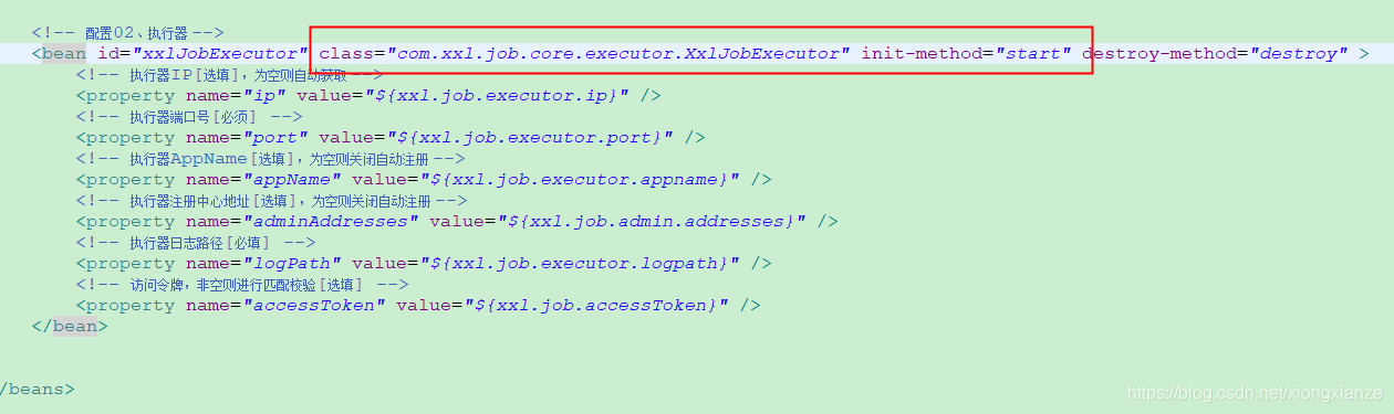 executor执行器初始化工作1.1 初始化工作这里我们使用xxl-job自带的xxl-job-executor-sample-spring作为本次源码解析的executor执行器端, 则executor执行器启动时, Spring容器会初始化XxlJobExecutor, 并调用init-method = start()方法.1.2 XxlJobExecutor类的start(...