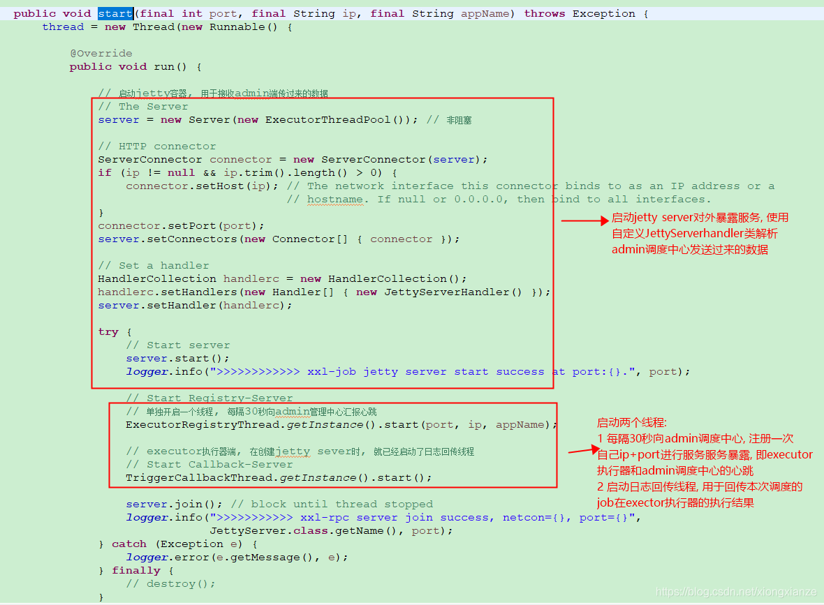 ③开启两个线程:向admin调度中心注册自己暴露服务的线程和回传任务执行结果的线程.