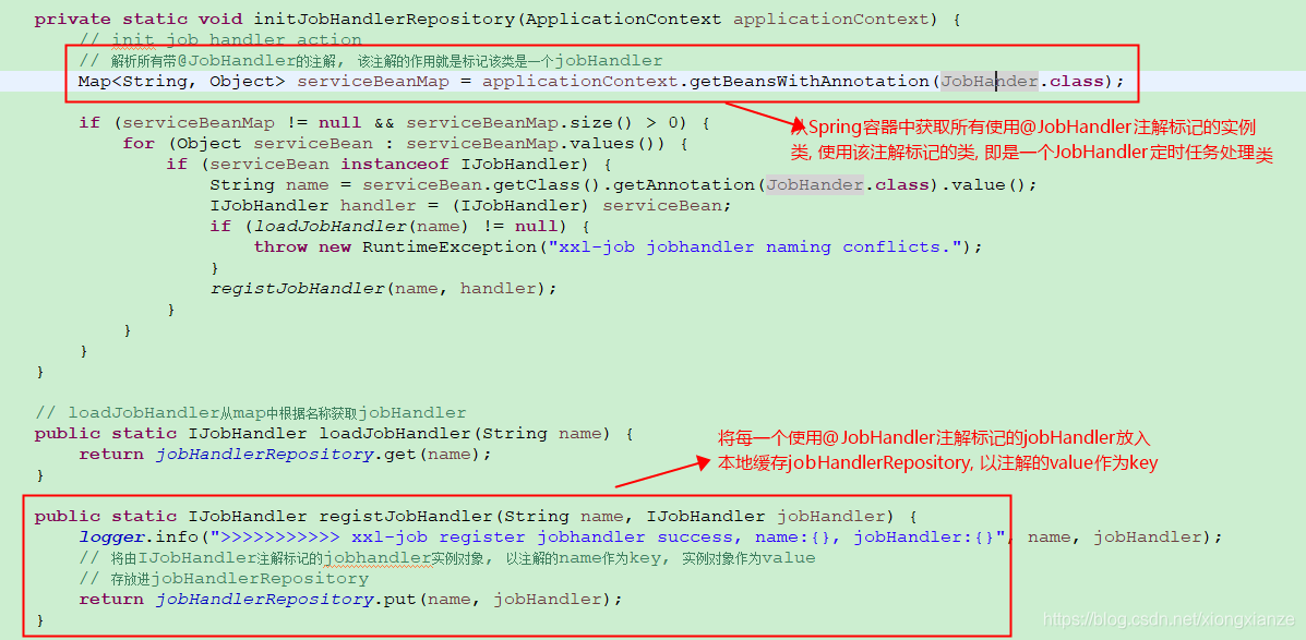 2 从Spring容器中取出使用@JobHandler注解标记的job任务处理类, 并放入本地缓存.