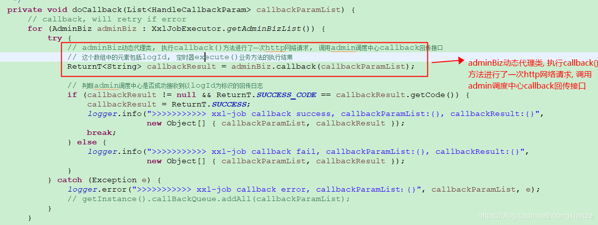 doCallBack()方法, 即是进行了一次http网络请求, 调用admin调度中心的callback回传接口, 回传executor执行器执行本次调度的结果给admin调度中心.