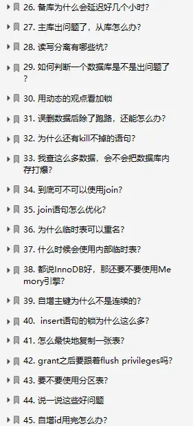 Tip:由于文章篇幅有限制,下面还有20个关于MySQL的问题,我都复盘整理成一份pdf文档了,后面的内容我就把剩下的问题的目录展示给大家看一下