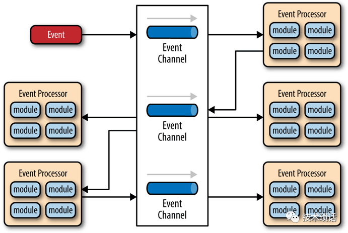 事件驱动架构 (Event-Driven Architecture):为了能让子系统互相通信,一种可行的方案是在子系统之间建立一套事件队列管道(Event Queues),来自系统外部的消息将以事件的形式发送至管道中,各个子系统从管道里获取自己感兴趣、能够处理的事件消息,也可以为事件新增或者修改其中的附加信息,甚至可以自己发布一些新的事件到管道队列中去,如此,每一个消息的处理者都是独立的,高度解耦的,但又能与其他处理者(如果存在该消息处理者的话)通过事件管道进行互动,如图 1-3 所示。