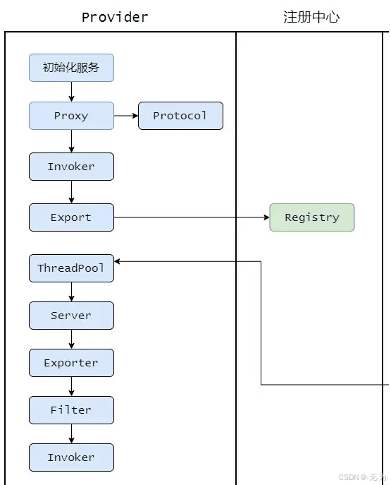 然后再通过 Exporter 包装一下,这是为了在注册中心暴露自己套的一层,然后将 Exporter 通过 Registry 注册到注册中心。 这就是整体服务暴露过程。