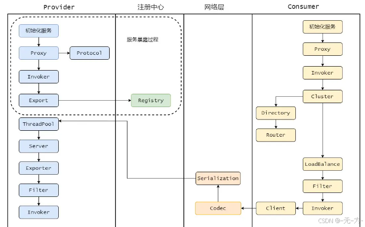 - Registry和Monitor实际上不算一层,而是一个独立的节点,只是为了全局概览,用层的方式画在一起。