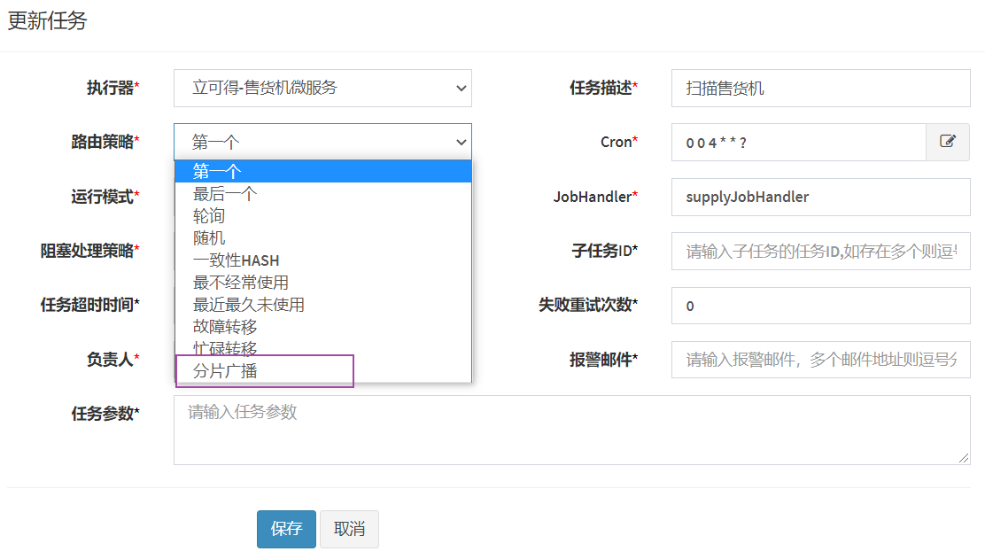 (1)修改调度中心扫描售货机任务的配置,路由策略选择"分片广播"