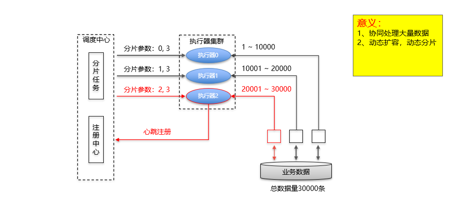 **分片广播任务:**执行器集群部署时,任务路由策略选择"分片广播"情况下,一次任务调度将会广播触发集群中所有执行器执行一次任务,可根据分片参数开发分片任务