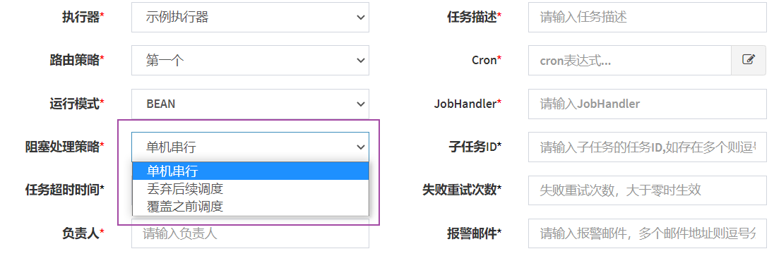 在我们在任务管理中新增任务窗口,会看到一个较阻塞处理策略的设置