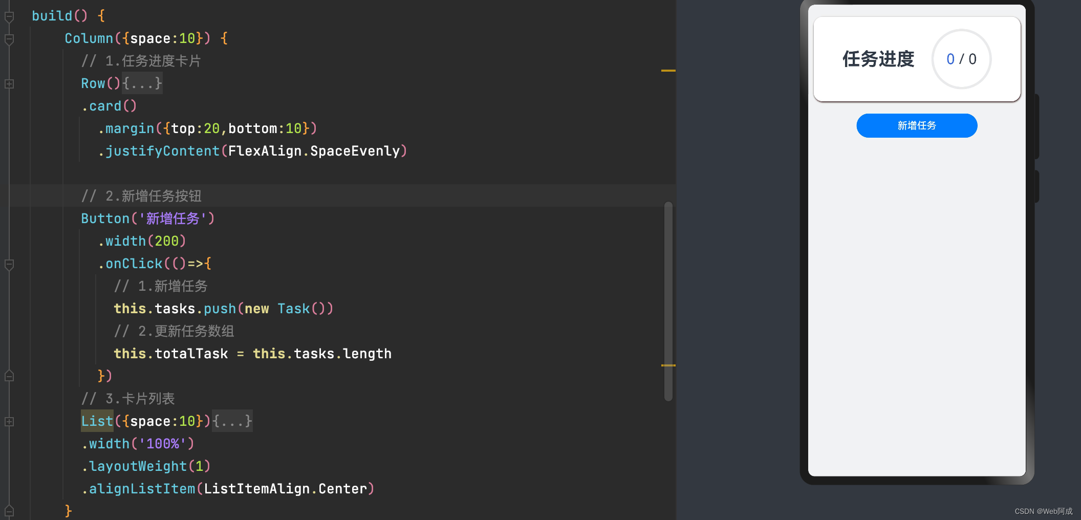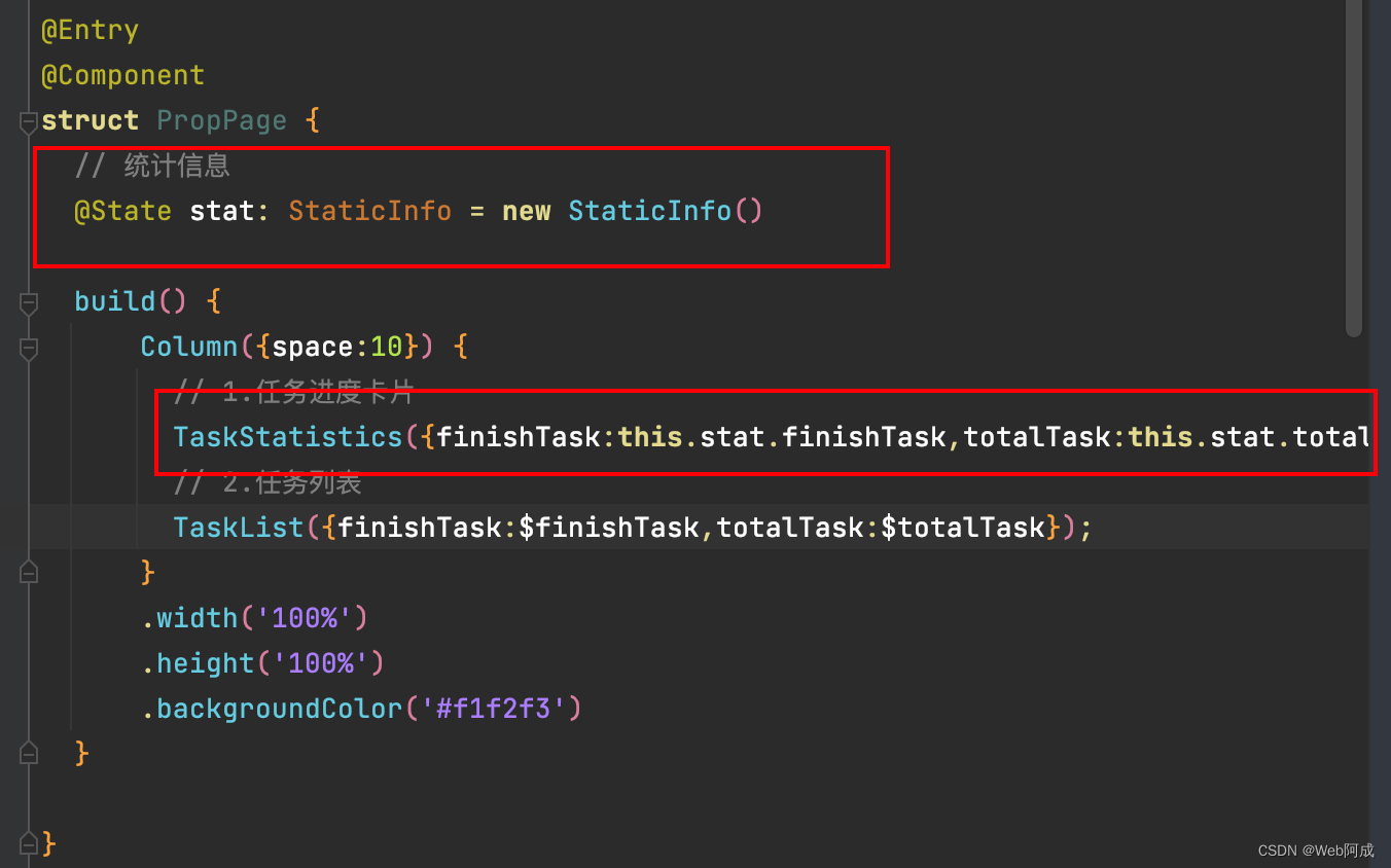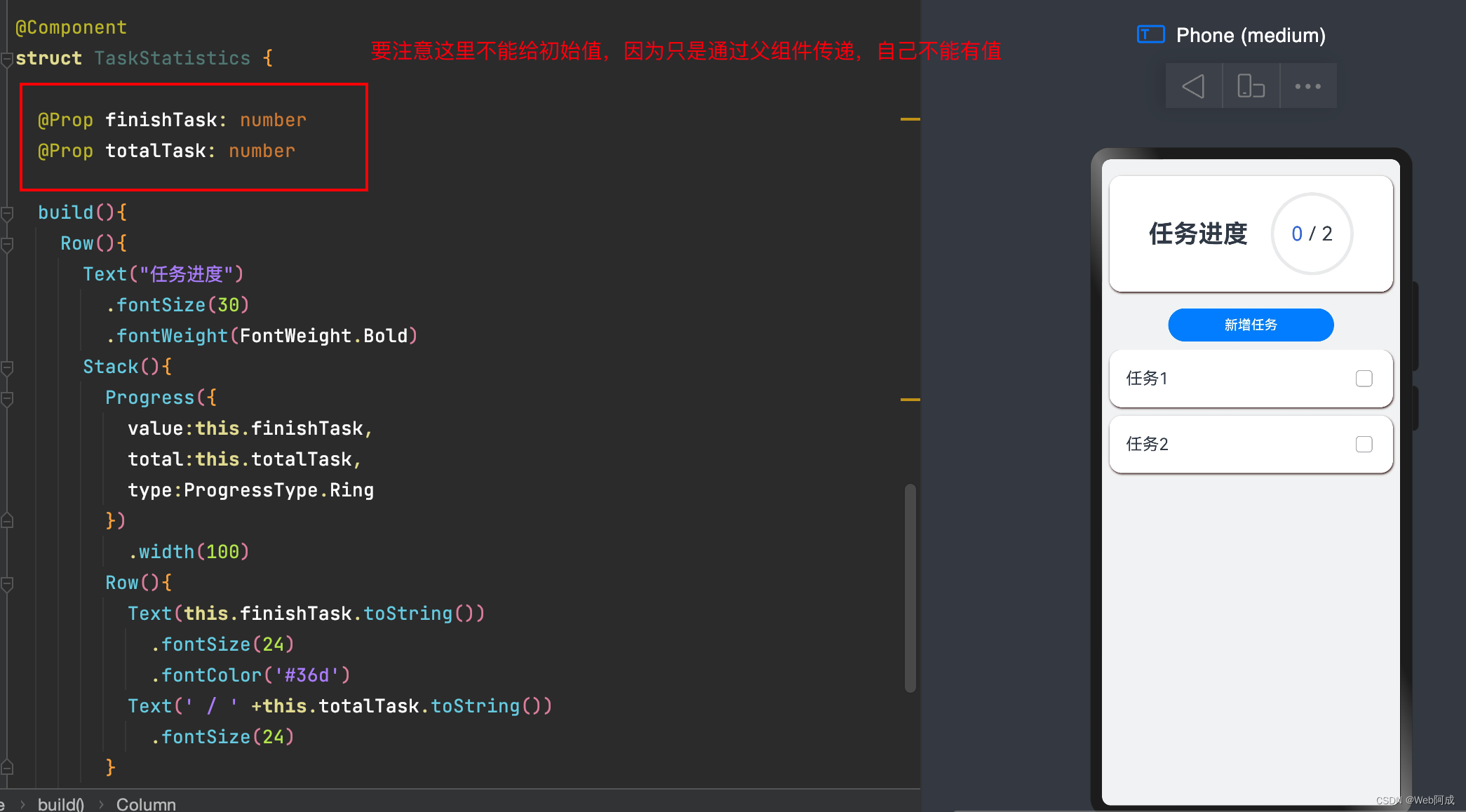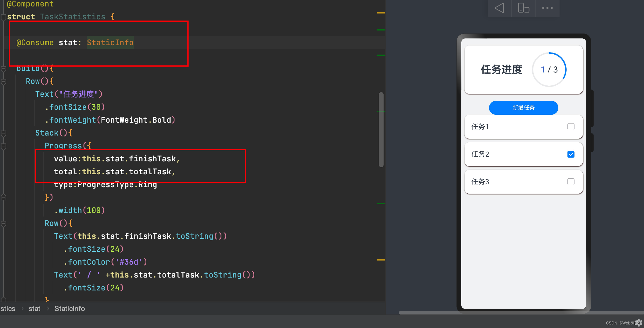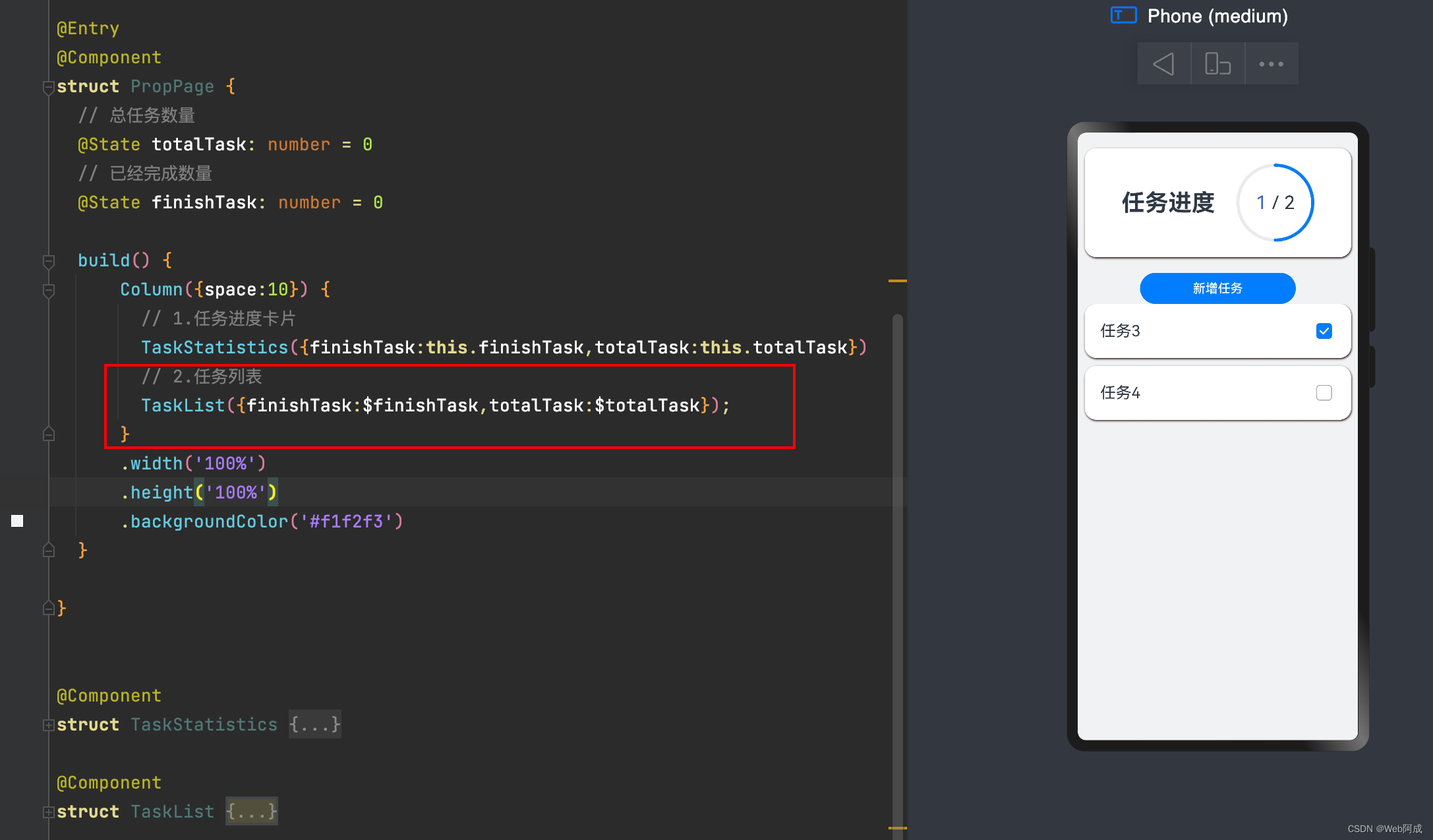 我们先用@State尝试着封装任务进度卡片组件,然后再入口函数中使用。