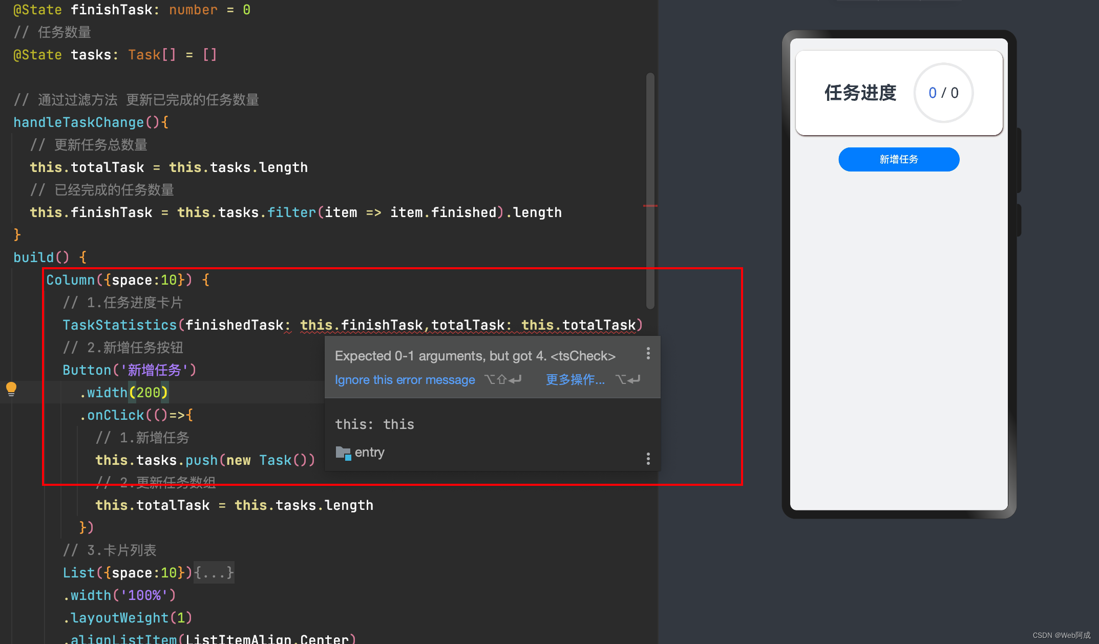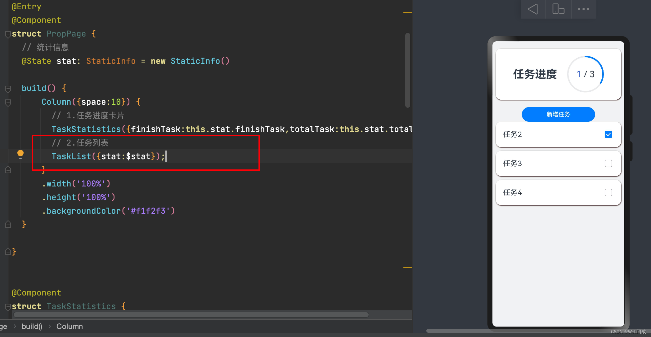 在封装任务列表的时候,要注意一些问题,比如说build函数下不能放入多个顶层,所以我们加一个Column容器,我们将按钮函数也加入。因为任务列表同任务进度是同步更新数据的,这里我们使用Link状态来完成。