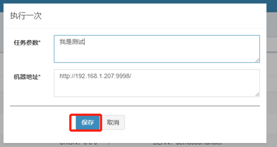 任务参数随便输入,机器地址为: http://192.168.1.207:9998/ ,第4步查看的,也就是管理端的地址加端口!!
