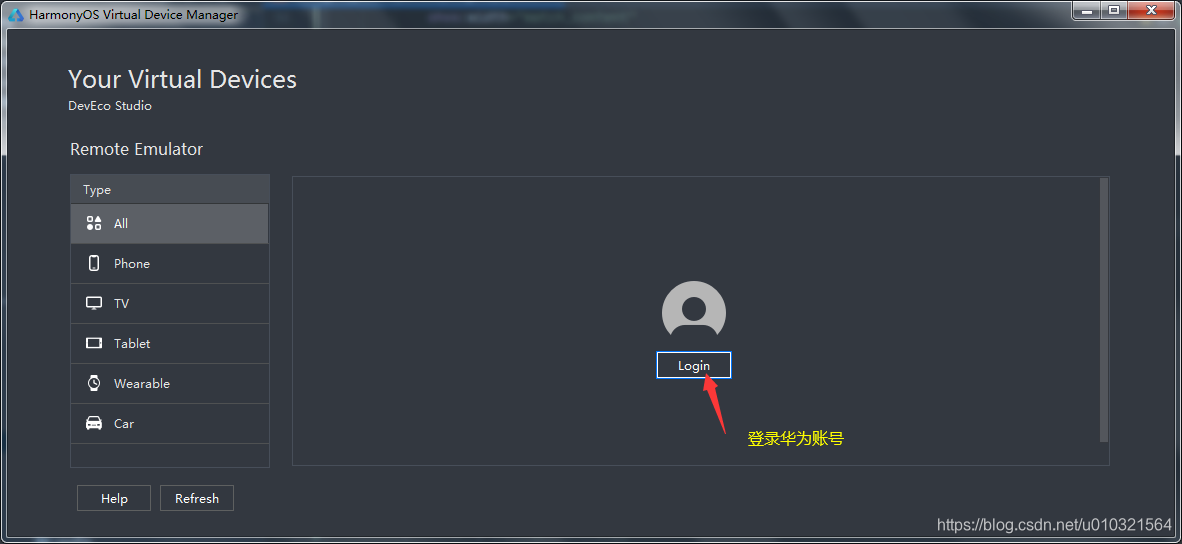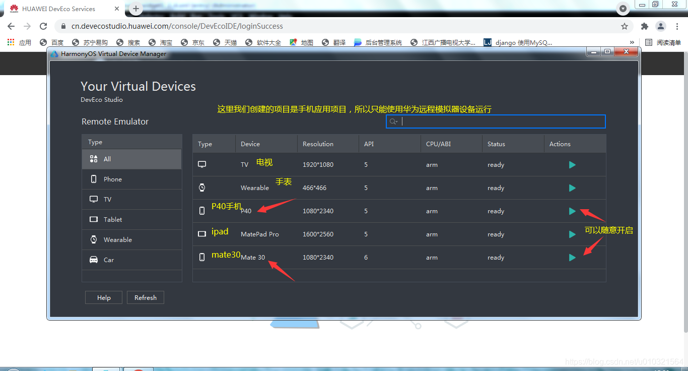 登录成功后,DevEco Studio会展示可以使用的不同设备的远程模拟器