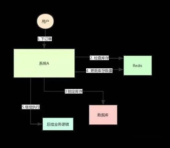 系统 A 是一个电商系统,目前是一台机器部署,系统中有一个用户下订单的接口,但是用户下订单之前一定要去检查一下库存,确保库存足够了才会给用户下单。由于系统有一定的并发,所以会预先将商品的库存保存在 Redis 中,用户下单的时候会更新 Redis 的库存。此时系统架构如下: