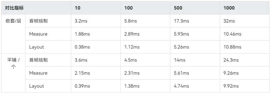 根据以上数据对比发现,组件平铺和嵌套在相同组件个数的情况下,其性能差异不大,并且整体上趋势保持一致,随着组件数量增加呈现线性增长的劣化,由此可以得到结论,真正影响布局性能的因素是参与布局的节点数量。所以在进行布局时,应该尽量减少整体的节点数,来减少布局的性能劣化。