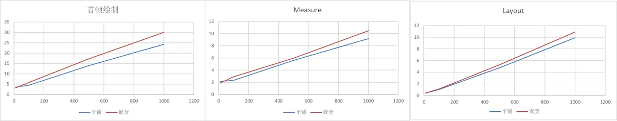 布局阶段是采用递归遍历所有节点的方式进行组件位置和大小的计算, 如果嵌套层级过深,将带来了更多的中间节点,在布局测算阶段下,额外的节点数将导致更多的计算过程,造成性能劣化。我们通过模拟了10、100、500、1000层Row嵌套的情况下,通过Profiler工具抓取Launch数据查看对应的首帧绘制,以及页面Measure/Layout时间进行对比。