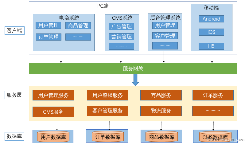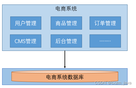比如搭建一个电商系统:客户下订单,商品展示,用户管理。这种将所有功能都部署在一个web容器中运行的系统就叫做单体架构。