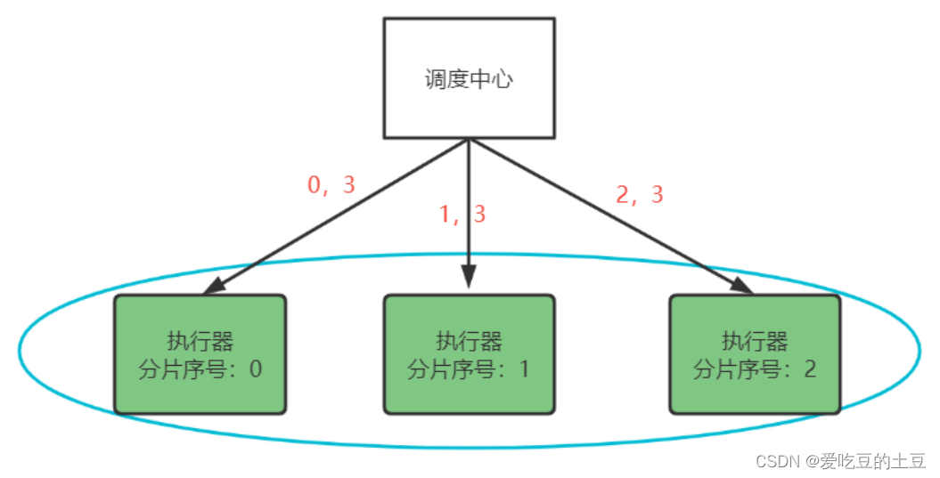下边要重点说的是分片广播策略,分片是指是调度中心以执行器为维度进行分片,将集群中的执行器标上序号:0,1,2,3...,广播是指每次调度会向集群中的所有执行器发送任务调度,请求中携带分片参数。