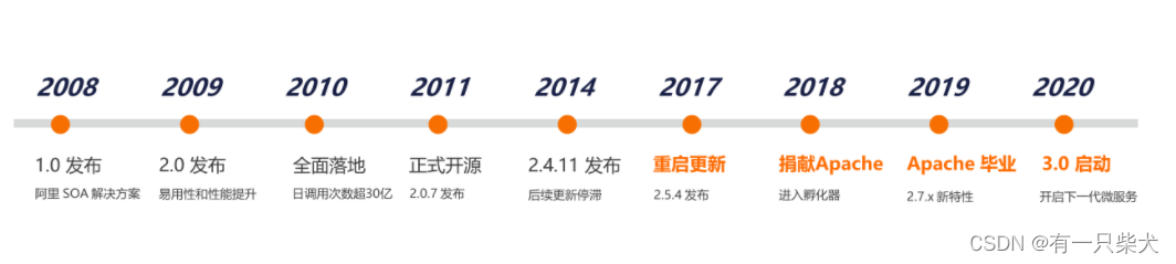 Dubbo是一个开源的Java分布式服务框架,最初由阿里团队于2011年开发,其设计目标是为了解决阿里巴巴内部的大规模分布式系统中遇到的问题,包括服务治理、RPC通信等。后来阿里团队将Dubbo贡献给了Apache开源基金会,开源后,得到了广泛的关注和使用。此后阿里团队宣布不在维护Dubbo框架(可能转到了SpringCloud Alibaba框架设计),Dubbo版本停在了2.x。此后当当网基于
