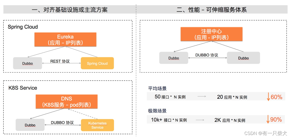 - 适配云原生微服务变革。云原生时代的基础设施能力不断向上释放,像 Kubernetes 等平台都集成了微服务概念抽象,Dubbo3 的应用级服务发现是适配各种微服务体系的通用模型。