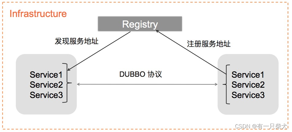 Dubbo2:Provider 注册服务地址,Consumer 经过注册中心协调并发现服务地址,进而对地址发起通信,这是被绝大多数微服务框架的经典服务发现流程。而 Dubbo2 的特殊之处在于,它把 “RPC 接口”的信息也融合在了地址发现过程中,而这部分信息往往是和具体的业务定义密切相关的。