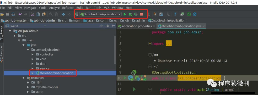 该工程是一个springboot项目,我们只需要在IDEA中执行 XxlJobAdminApplication 类即可运行该工程:
