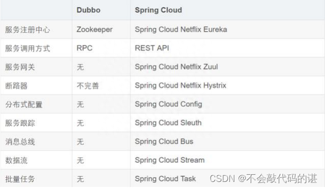 Dubbo 是 SOA 时代的产物,它的关注点主要在于服务的调用,流量分发、流量监控和熔断。而 Spring Cloud 诞生于微服务架构时代,考虑的是微服务治理的方方面面,另外由于依托了 Spirng、Spirng Boot 的优势之上,两个框架在开始目标就不一致,Dubbo定位服务治理、Spirng Cloud 是一个生态。