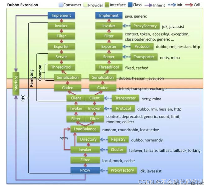 3.服务代理层(Proxy):服务接口透明代理,生成服务的客户端 Stub和服务器端 Skeleton。