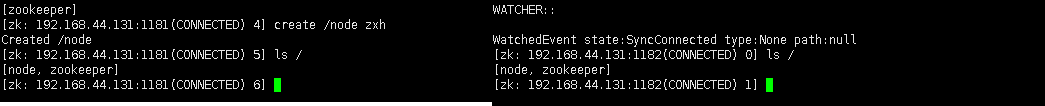我们zkCli连接了zk1服务1181,并且创建的一个zk节点名为node。我们在去zk2服务上同样可以看到这个node节点。