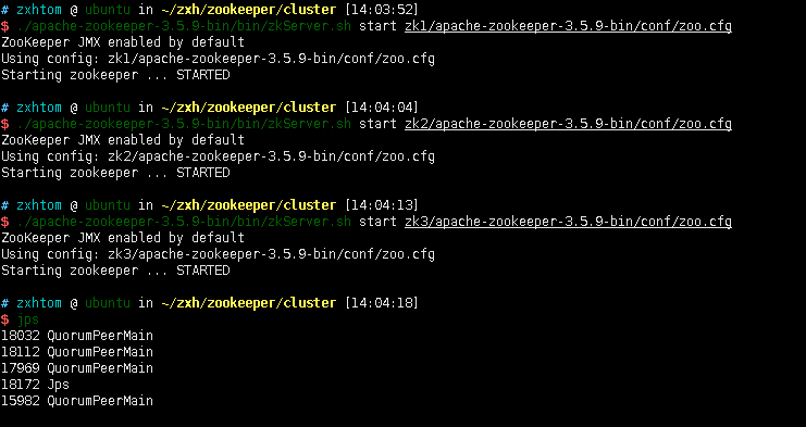 - 上面我是通过zkServer启动不同配置文件。你们也可以在不同的zk包下分别启动。最终效果是一样的。启动完成之后我们通过jps查看可以看到多了三个zk服务。在单机版的时候jps我们知道zk的主启动是QuorumPeerMain。
