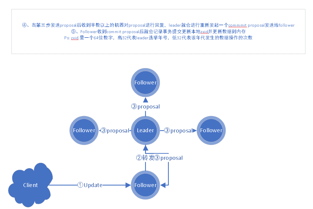 - client如果直接将数据变更请求发送到leader端,则直接从图中第三步开始发送proposal请求等待过半机制后再发送commit proposal。follower则会开始更新本地zxid并同步数据。